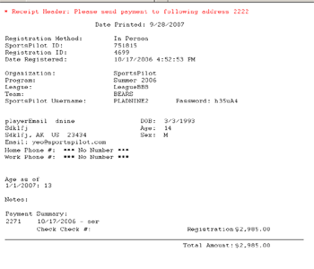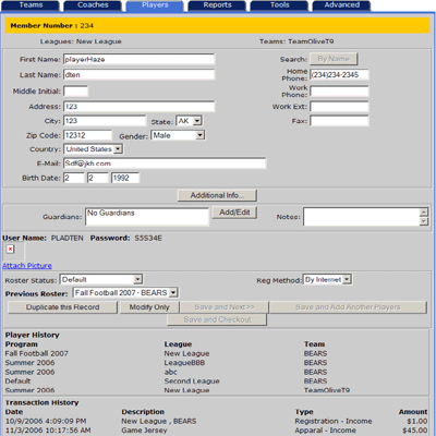 will show the date the player registered, program, league, team, profile, and payment type.